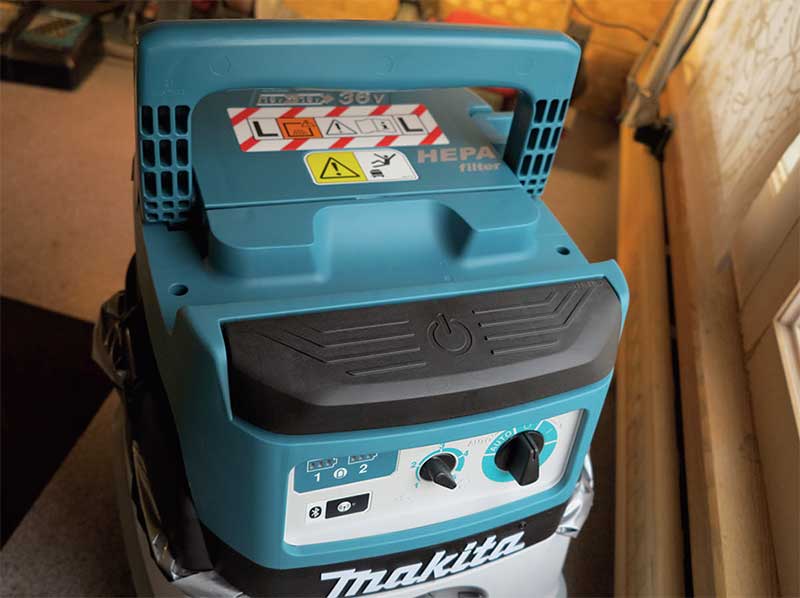 Сам пылесос достаточно устойчив: он невысокий, центр тяжести расположен низко, по- этому его сложно опрокинуть, когда он следует за инструментом. Два из четырёх сдвоенных колёс имеют стопор. Что любопытно — пылесос можно ставить на систейнер Makita Makpac, колёса точно попадают в соответствующие вырезы. Складывая инструмент в машину или возле лифта… да где угодно, можно не опасаться его падения.