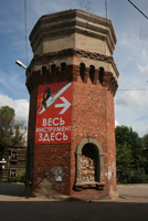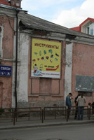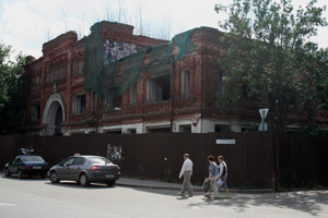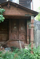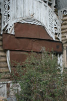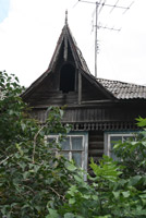 А вот другая «визитная карточка» пустует. Крыша просела, изящная башенка (просто мини-домик на курьих ножках) накренилась, окна закрыты железом… Грустный вид этого купеческого домика с заросшим бурьяном двором наводит на мысли, что жить ему осталось не так много (если, конечно, не принять меры).