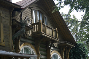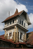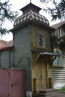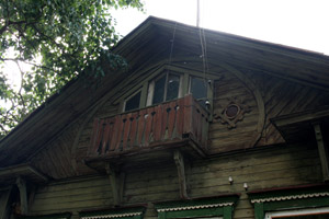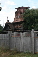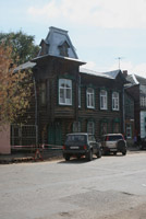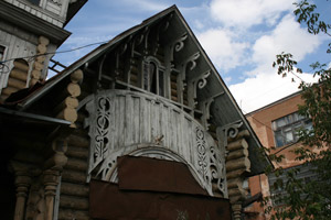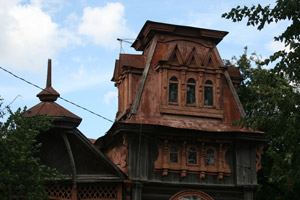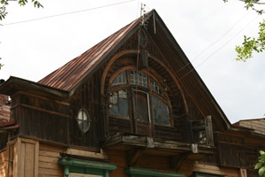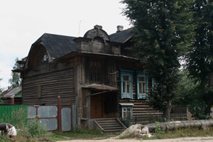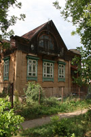 Есть у города пара «визитных карточек» — деревянные домики, один из которых стоит на волжской набережной, а второй на центральной улице.В первом и сейчас живут люди – он неплохо сохранился. Видимо, жильцы привыкли к наплыву туристов с фотоаппаратами, поэтому внимания на них не обращают – сидят себе на веранде и пьют чай за разговорами… Домик сразу привлекает внимание – необычными формами, резными деталями, красивым круглым окном. У форм и деталей, как видно, «ноги растут» из модерна, однако на свой, провинциально-волжский манер. Я не зря говорю «волжский», потому что в городках вдоль Волги можно встретить подобные домики-теремки. Для модерна, к слову, дерево – материал экзотический.