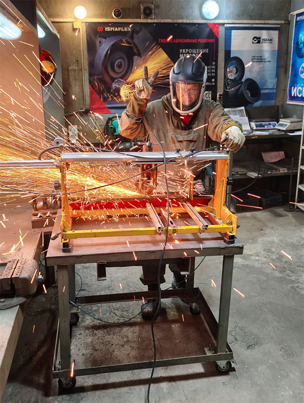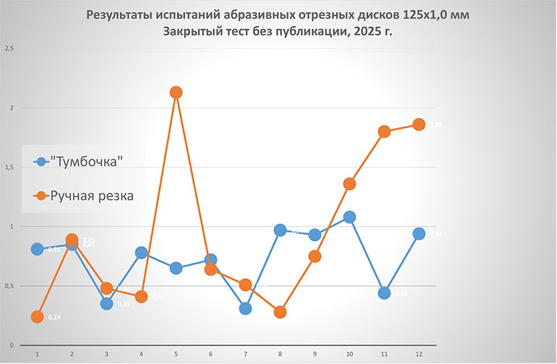 Это вариант, когда в качестве привода круга используется УШМ, но подача круга в зону реза не вручную, а с помощью каких-то приспособлений, исключающих боковую нагрузку и стабилизирующих подачу. То есть исключающих наиболее распространенные субъективные факторы. Мы как раз такой подход используем, иногда он встречается у блогеров. Кстати, в таких случаях материалы бывают как минимум на первый взгляд вполне серьезными. Даже если нагрузку создает какая-нибудь гиря на веревке – все равно получается довольно точно. Мы и сами сейчас гирю используем, но это для теста пильных дисков. И уже делаем новый стенд, на пневматике – это должно повысить скорость, но точность как минимум не ухудшится.