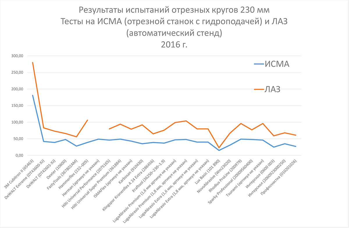 Так же, как идеальный абразивный диск. Его не существует. В обычной практике абразивы применяют по разным материалам, используют инструменты разной мощности, разные приемы резки. Логично предполагать, что условия в ходе теста должны быть максимально близкими к условиям эксплуатации, чтобы по результатам испытаний сразу было понятно, чего ждать от диска в реальной работе. Но тогда получается, что наиболее близкий к идеалу тест может быть только под какого-то конкретного клиента, на его материале, с его инструментом и даже его персоналом. Только так можно учесть все нюансы, способные оказать влияние на результат. При прямых продажах так и делают, но это даже чисто экономически целесообразно при больших объёмах продаж, и работает только на того клиента, к кому приехали демонстраторы. Предъявлять эти результаты другому клиенту, у которого другой материал, уже не имеет смысла – там условия совершенно другие.