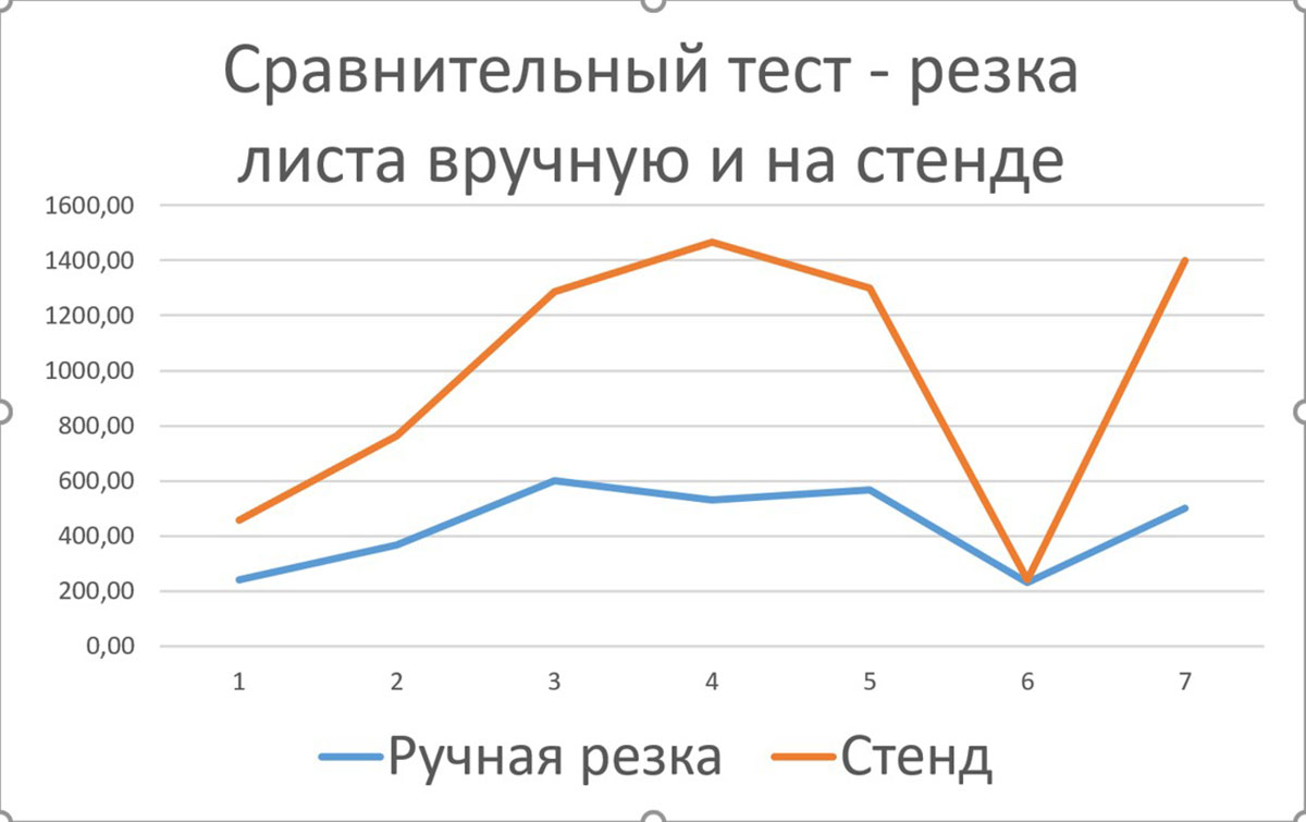 Мы проводили эксперименты с целью понять, есть ли зависимость между испытаниями на «тумбочке» и вручную. Брали одинаковые круги, один и тот же материал, и резали, сравнивали. На графике результаты… и между ними нет вообще никакой связи.